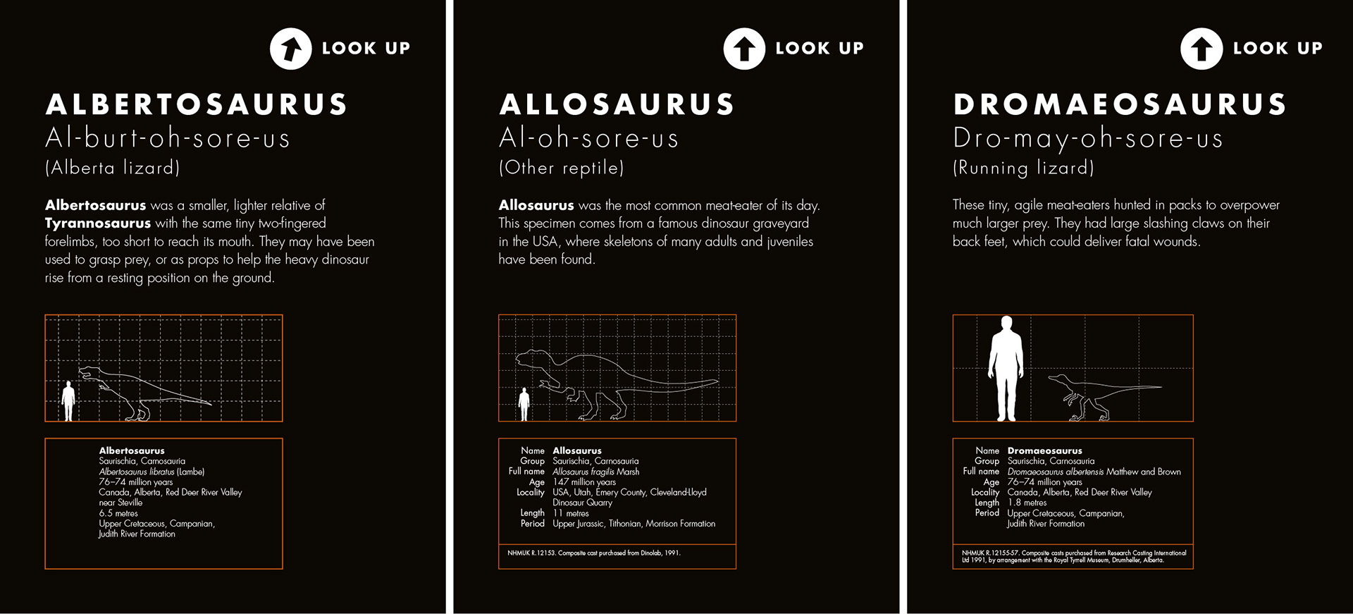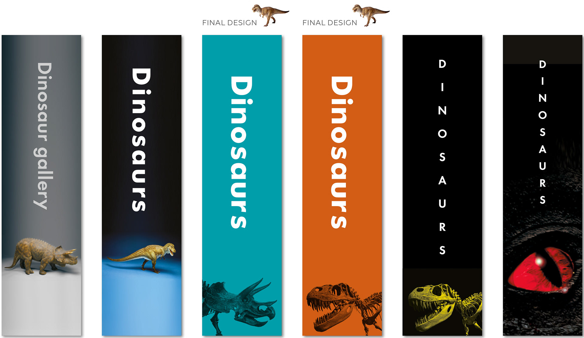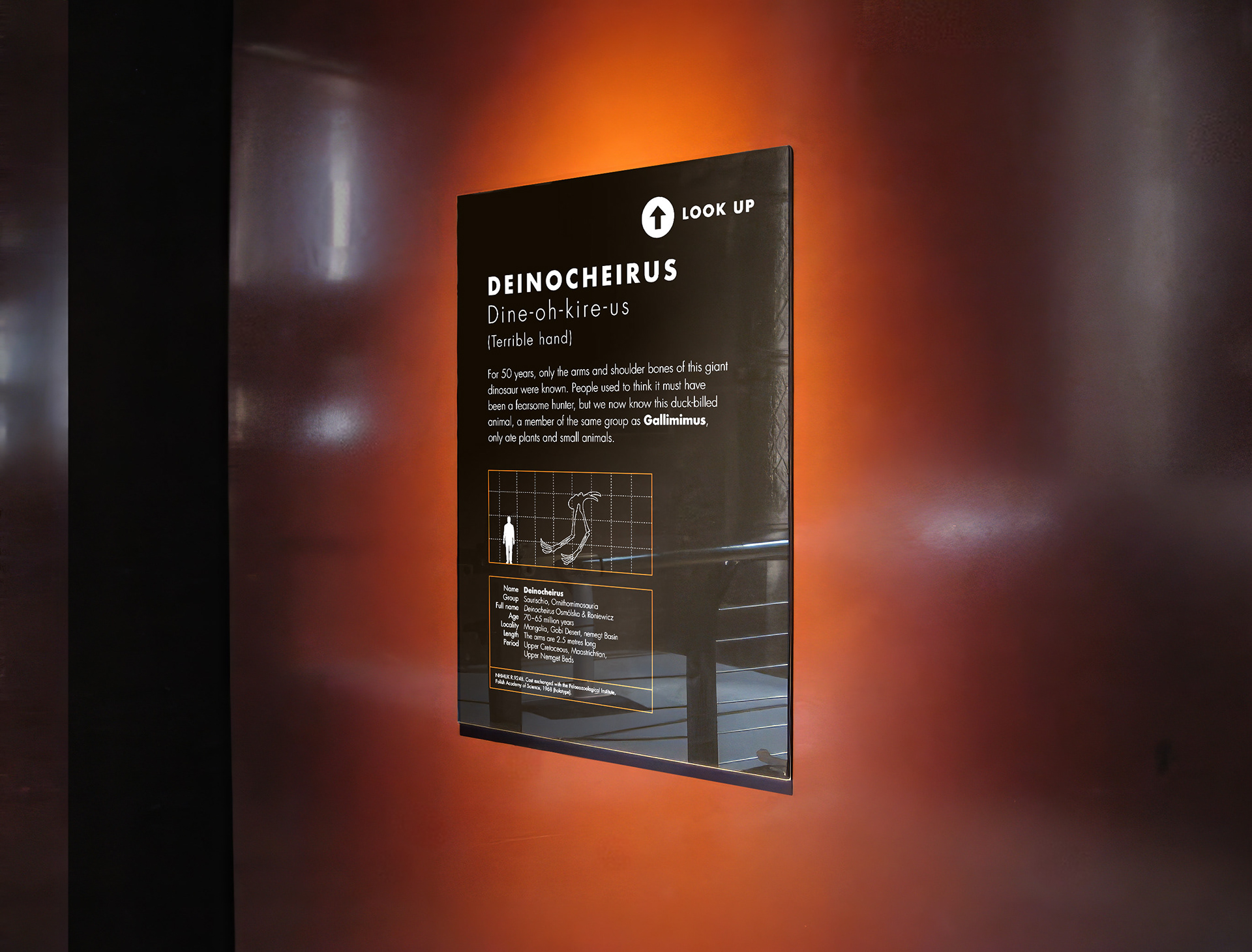 Wayfinding and informational signage for the various exhibits in the museum, including the Dinosaur Gallery.